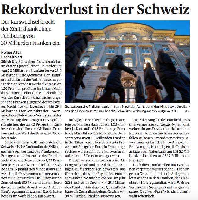 Schließlich haben diese jetzt deutlich höhere Absatzschwierigkeiten im Ausland, da sich durch die Aufwertung des CHF (zum Euro in der Spitze um 30%), die Dienstleistung oder die Produkte verteuern. Die SNB hat dies nicht ohne Grund in Kauf genommen und so dem Kursversfall des SMI-Index in Höhe von über 13% provoziert. An der Börse in Zürich wurde am 15.01. Geld im Wert der gesamten Wirtschaftsleistung der Schweiz in einem Quartal vernichtet. Es blieb ihr schlicht weg keine andere Wahl!